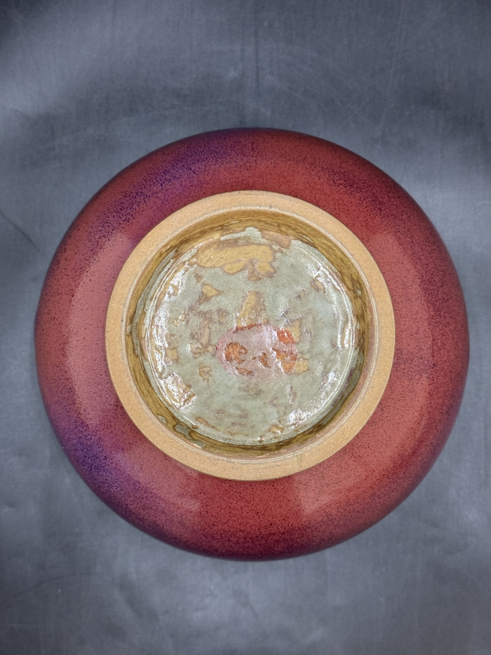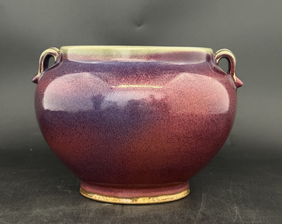 它是鈞窯雙系罐型的元代典范——罐身飽滿如滿月,雙系耳設計精巧雅致,既延續了宋鈞的釉色神韻,又融入元代器物的雄渾風骨。往昔是市井儲物、貴族陳設的雅器,如今歷經數百年滄桑,釉色依舊紫艷灼人,器型挺拔大氣,將元代瓷藝“粗獷中見精細”的美學精髓演繹到了極致!