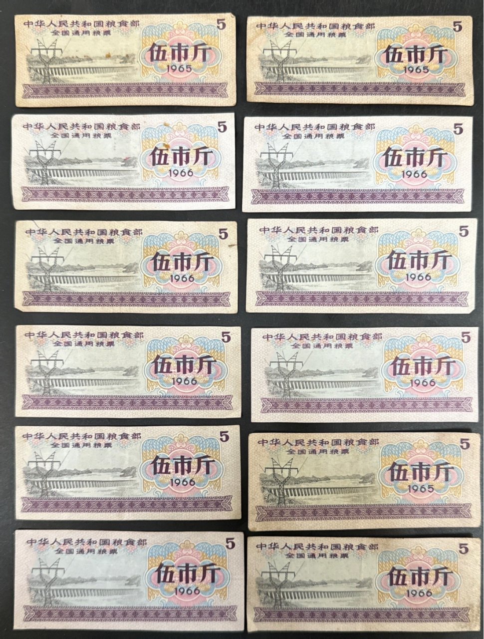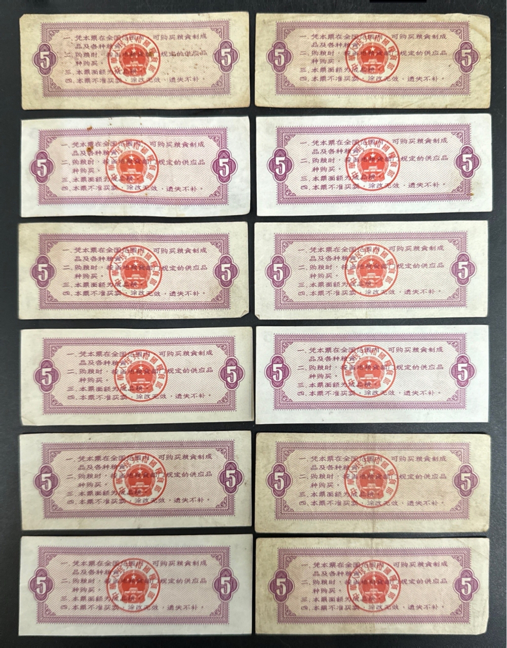 這組全國(guó)通用糧票伍市斤(十二張),是我國(guó)計(jì)劃經(jīng)濟(jì)時(shí)期糧食供應(yīng)制度的實(shí)物見(jiàn)證,具有較高的歷史與收藏價(jià)值。