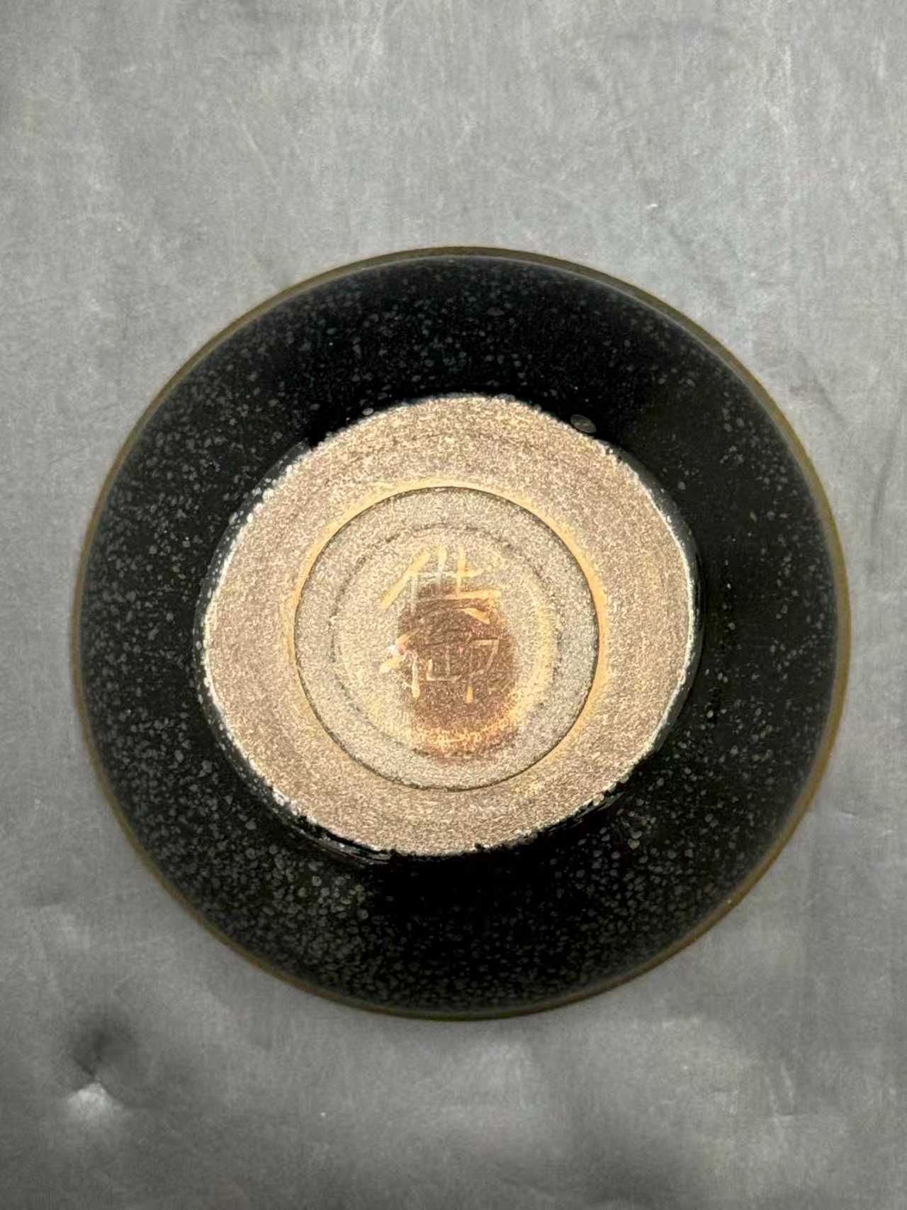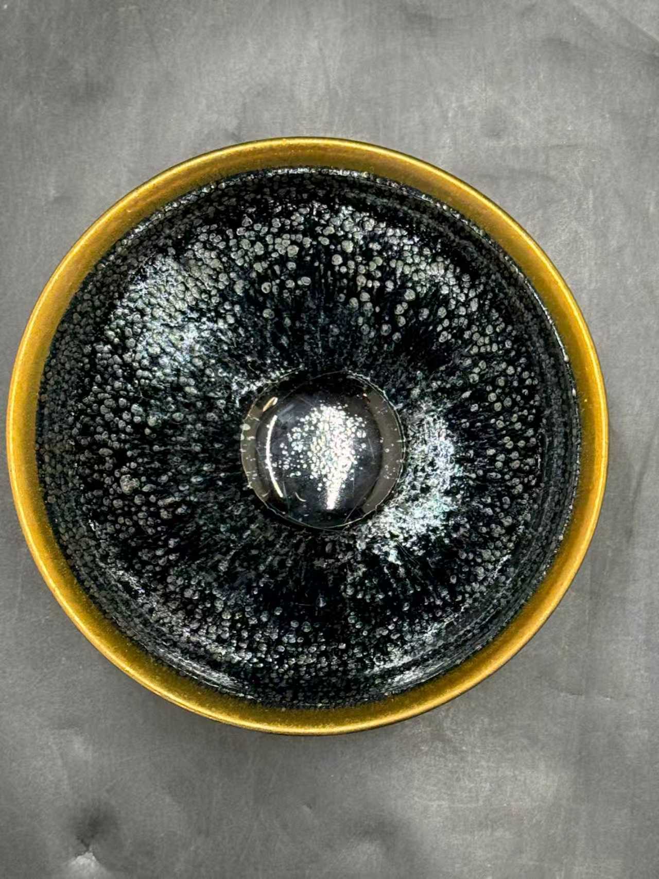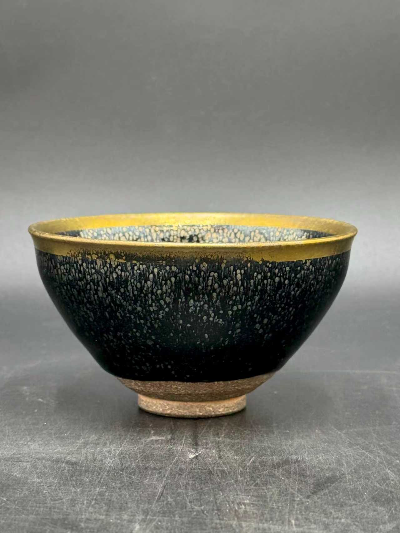 建窯 “油滴” 以其釉面密布的銀灰色圓斑著稱,這些斑點如星子墜入墨夜,似油珠浮于靜水,在光線下閃爍著金屬般的璀璨光澤。每一枚圓斑都是窯火與釉料的天成之合:鐵元素在高溫中劇烈運動、凝聚,最終形成獨一無二的 “油滴” 肌理 ——沒有兩件建窯油滴是相同的,這是古瓷藝中 “天工造物” 的最佳注腳。本品釉色黑如漆,油滴銀似霜,盞沿金飾更添華貴,于古樸中見典雅,將宋代 “極簡美學” 與工藝巧思融為一體。捧于手中,仿佛能看見南宋茶人執盞品茶、論道賞器的雅致場景。