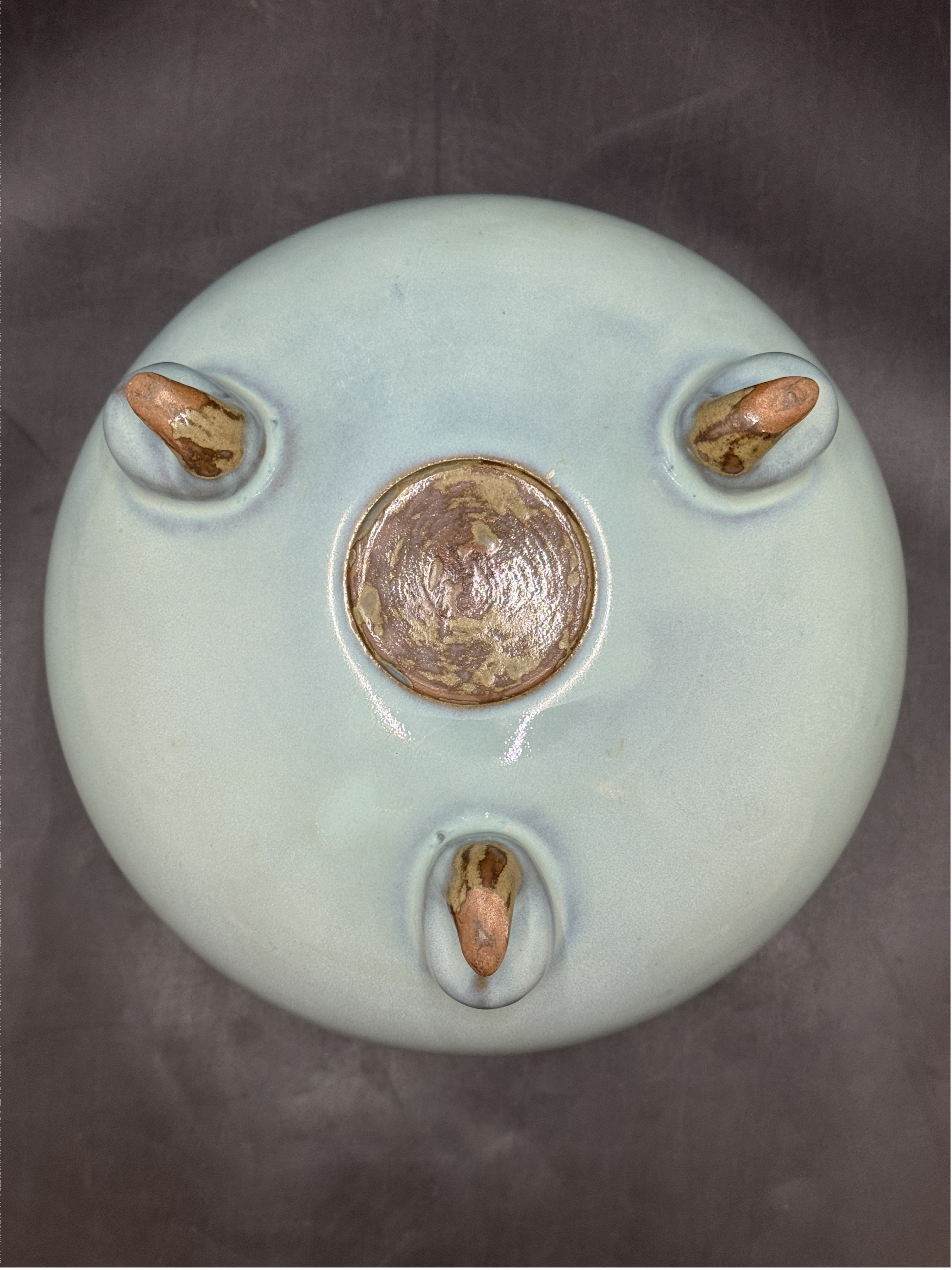 這件器物取三足爐之型制,器型規整大氣,腹部豐腴圓潤,三足設計既在實用上確保了穩定性能,又借由對稱美學營造出莊重典雅的氣韻。其胎質致密堅致,成型工藝極為精湛,經高溫燒制后器型毫無變形,足見宋代制瓷匠人對胎體塑形技藝與燒成火候節奏的高超駕馭力。三足塑造得圓潤且富有張力,底部露胎處的與月白釉形成鮮明質感對比,進一步凸顯出鈞窯“胎釉共生”的獨特工藝特質
