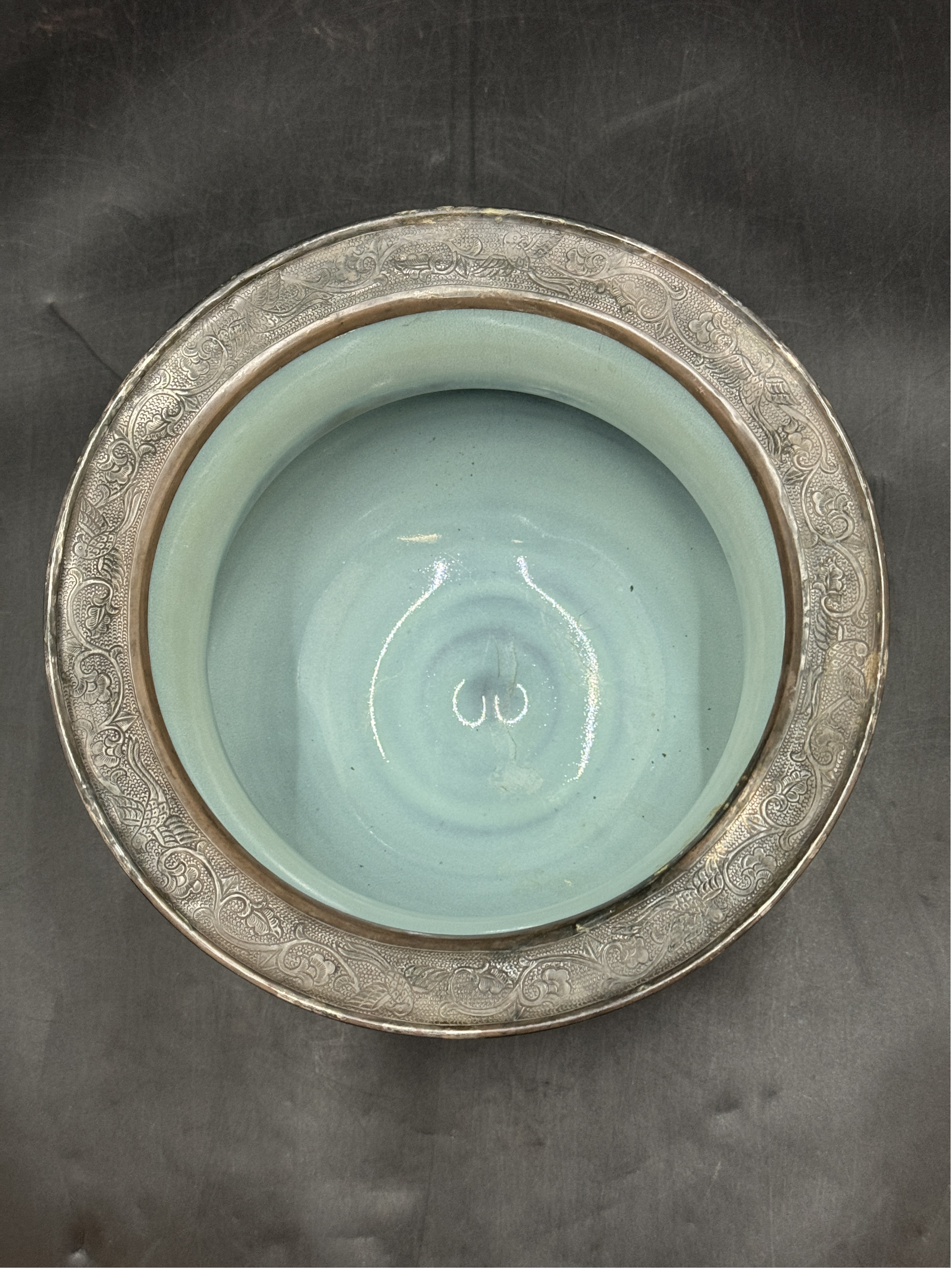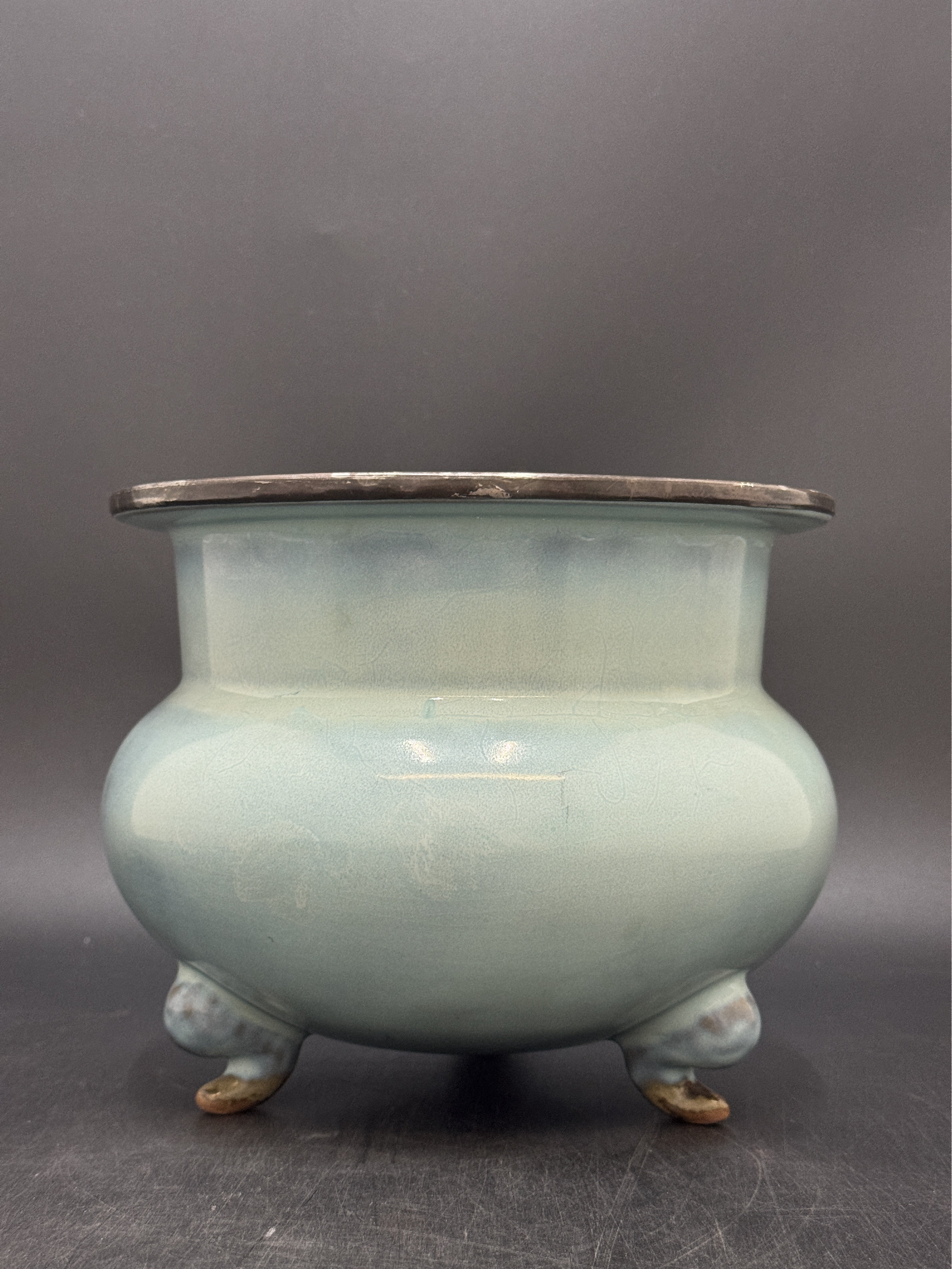 口沿的金屬包邊工藝精細考究,紋飾繁縟精美,不僅是對器物的實用性保護,更可能反映了宋代的使用習慣或文化交流背景,為研究宋代瓷器的工藝交流、社會用瓷風尚提供了實物線索。作為宋代鈞窯的代表性器物,它承載了鈞窯的工藝精髓,是研究宋代鈞窯形制、釉色、工藝乃至社會文化的關鍵標本,具有極高的歷史與藝術研究價值。同時,它也生動詮釋了宋代陶瓷藝術“器以載道” 的文化內涵,是中國古代陶瓷藝術史上的精品遺存。