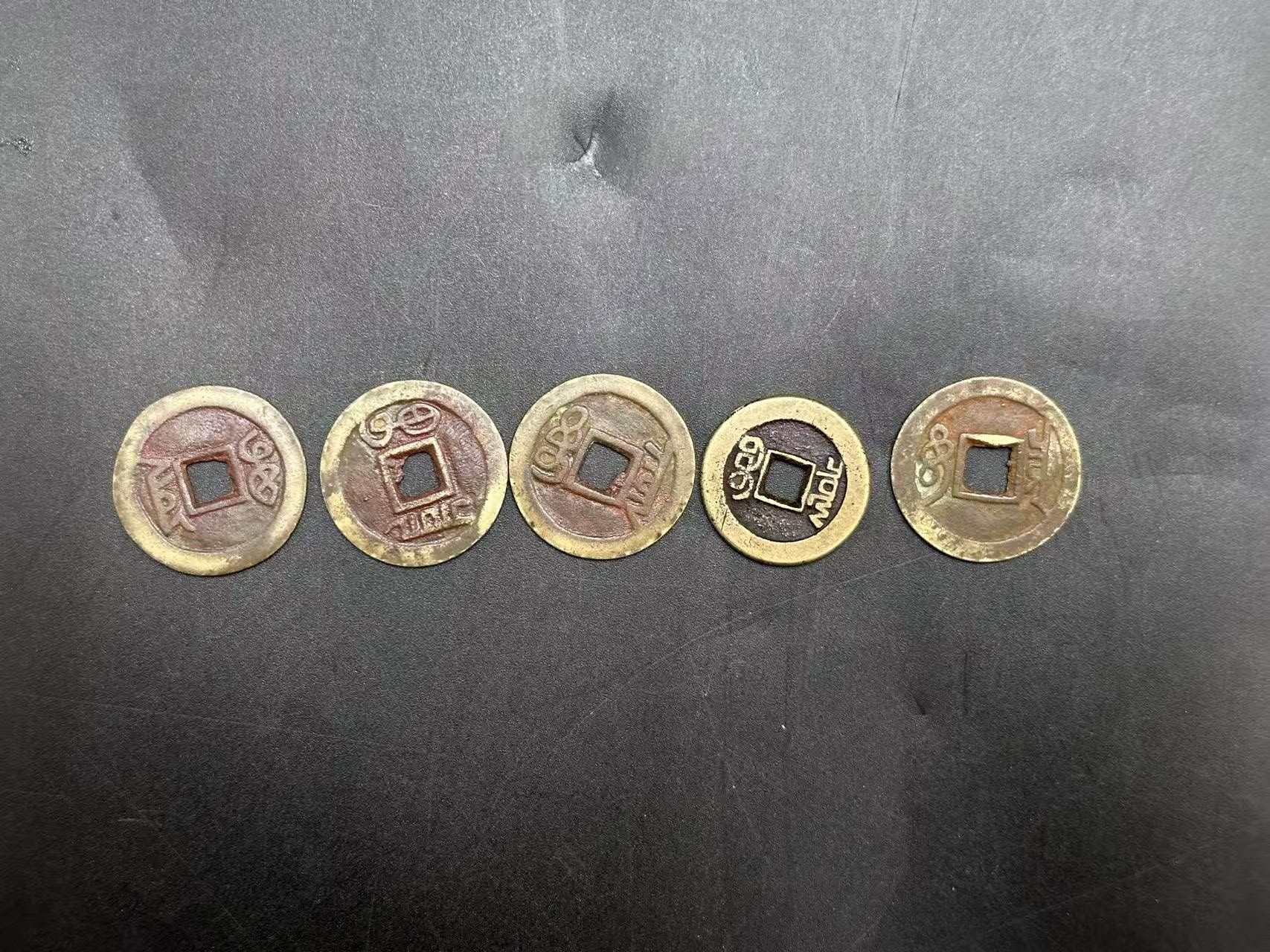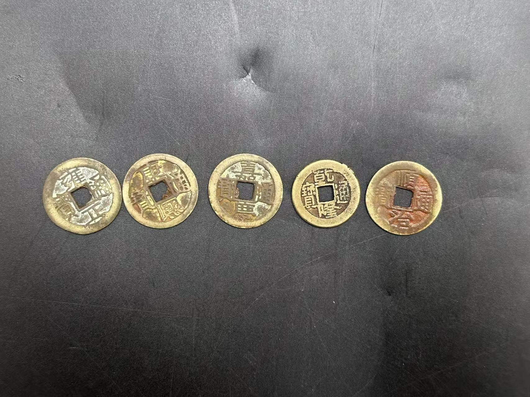 這組五帝錢是清代五位帝王(順治、康熙、雍正、乾隆、嘉慶)在位期間鑄造的銅錢組合,是傳統民俗與錢幣收藏領域極具代表性的藏品。 從材質與外觀來看,它們以黃銅鑄造,歷經歲月沉淀,表面形成了自然的氧化包漿,呈現出黃褐、紅褐等混合色澤,部分錢幣還帶有磨損痕跡,盡顯歷史的滄桑感。
