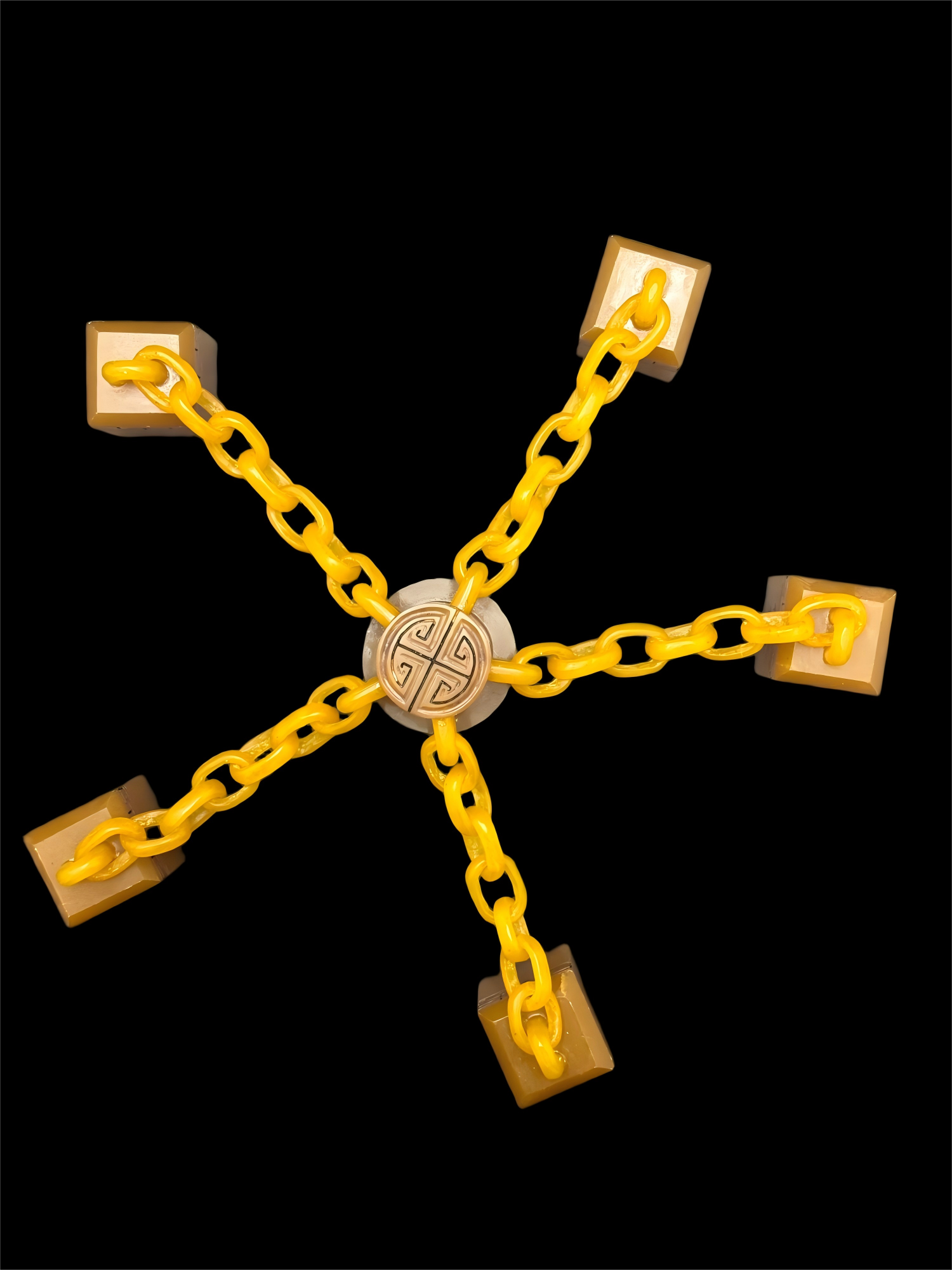 它以名貴的田黃石為材,田黃石色澤溫潤凝膩,呈典型的雞油黃色,質地細膩如脂,是田黃石中的上佳品類。印章由一枚主印和五枚副印組成,通過黃色鏈環相連,鏈環與印章材質一致,且鏈環的鑄造工藝精湛,環環相扣,毫無拼接痕跡,體現出高超的雕琢技藝。