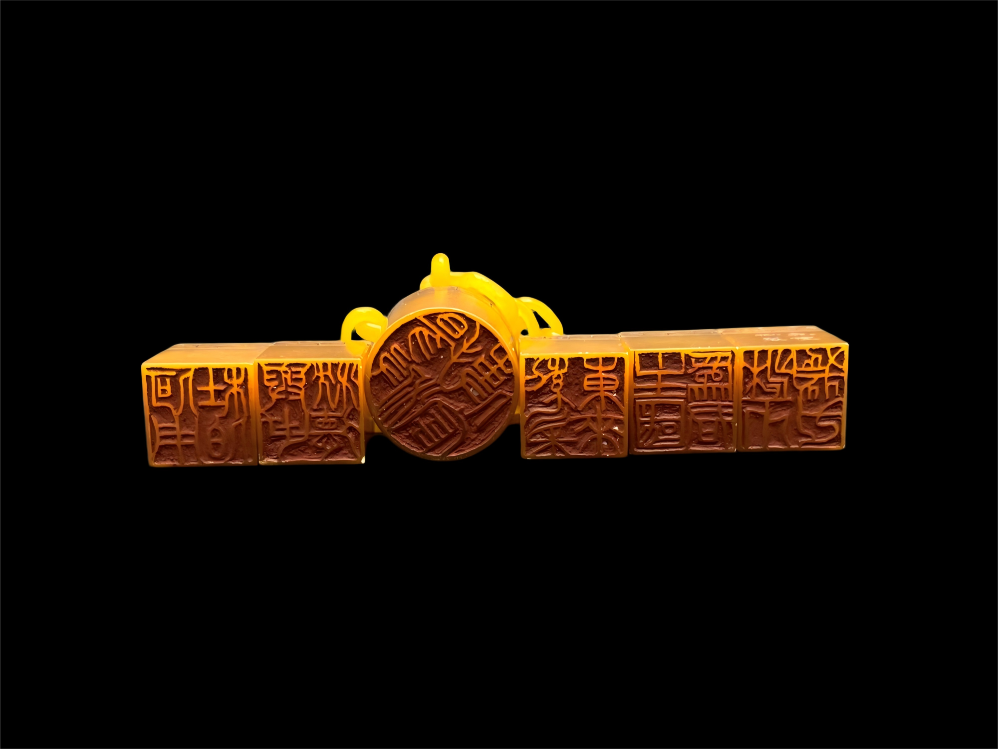 這組乾隆六連田黃印章是清代宮廷璽印中的珍品,在材質、工藝與文化價值上都極具分量。