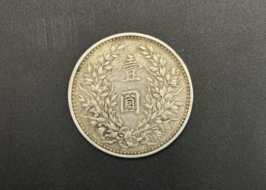 正面圖案中央是袁世凱的側面肖像,肖像刻畫細膩,袁世凱面容清晰,神態(tài)莊重,身著軍裝,領口細節(jié)與肩章紋飾可辨。肖像左側可見特殊的簽字印記,這是“錢莊簽字版”的典型特征,字體小巧精致,為該銀幣增添了獨特的辨識度。肖像外圍環(huán)繞著“中華民國三年”字樣,字體端莊規(guī)整,筆畫清晰。背面中央鑄有“壹圓”二字,字體較大且醒目,周圍環(huán)繞著嘉禾紋飾,嘉禾圖案線條流暢,谷穗飽滿,寓意五谷豐登、國泰民安。