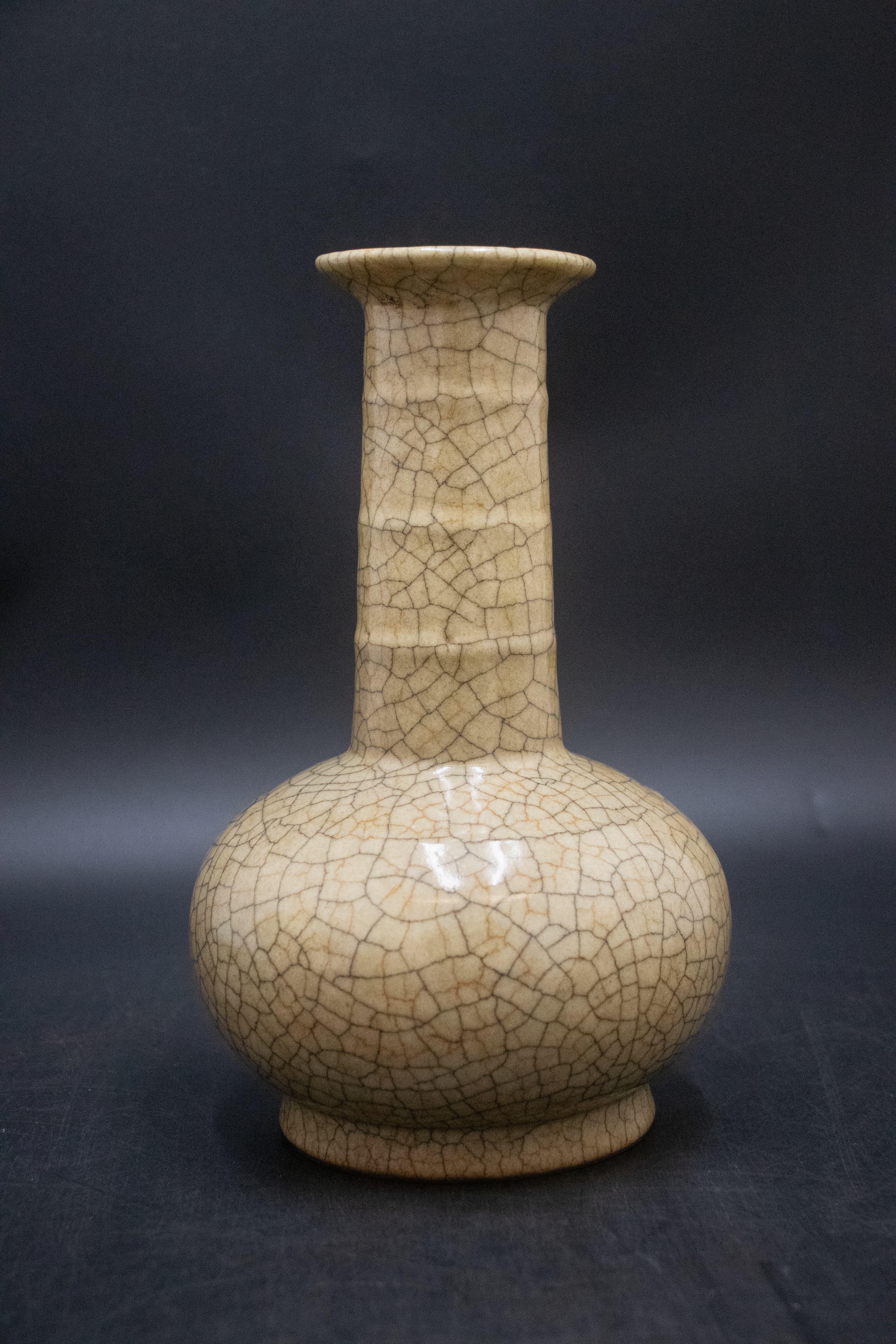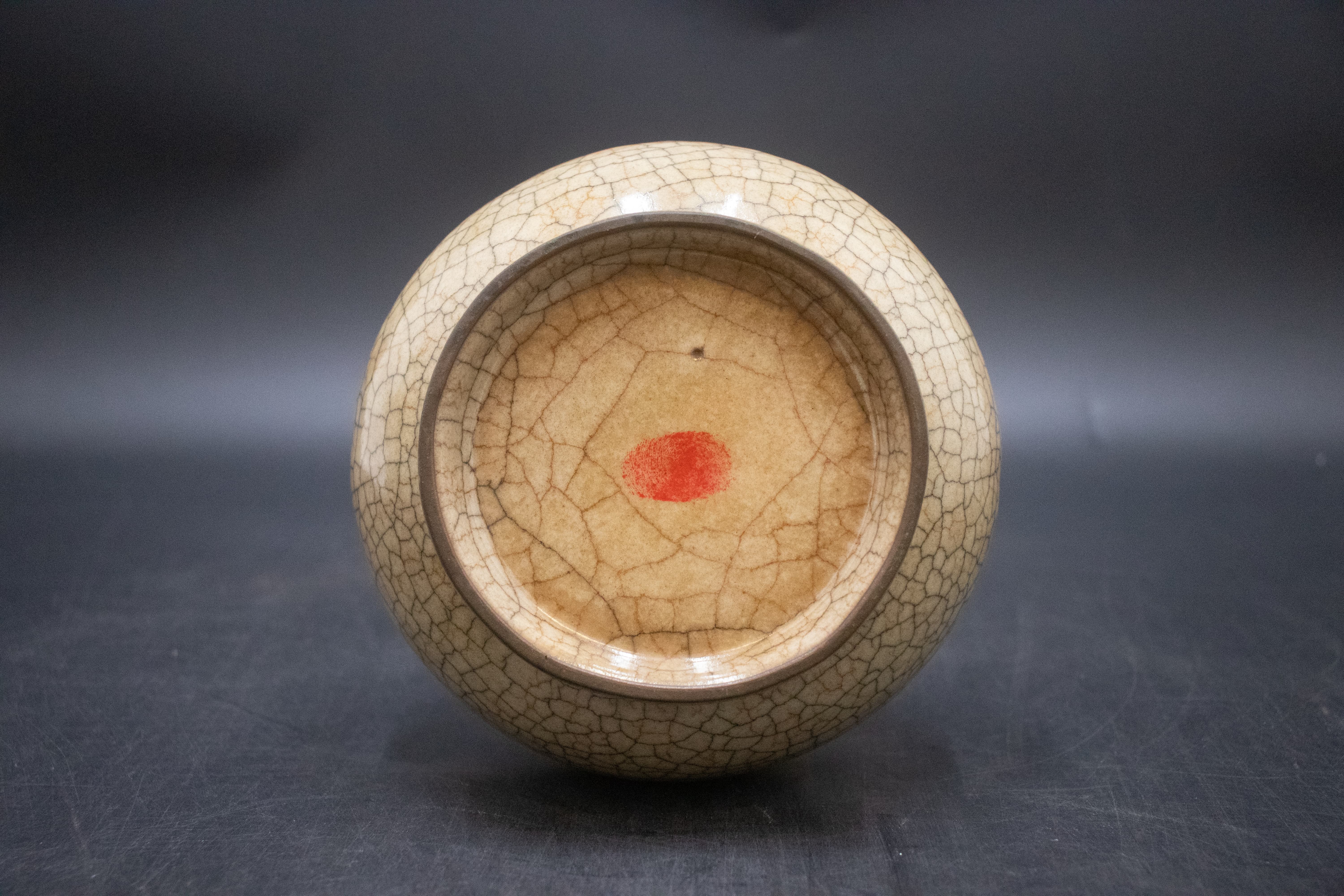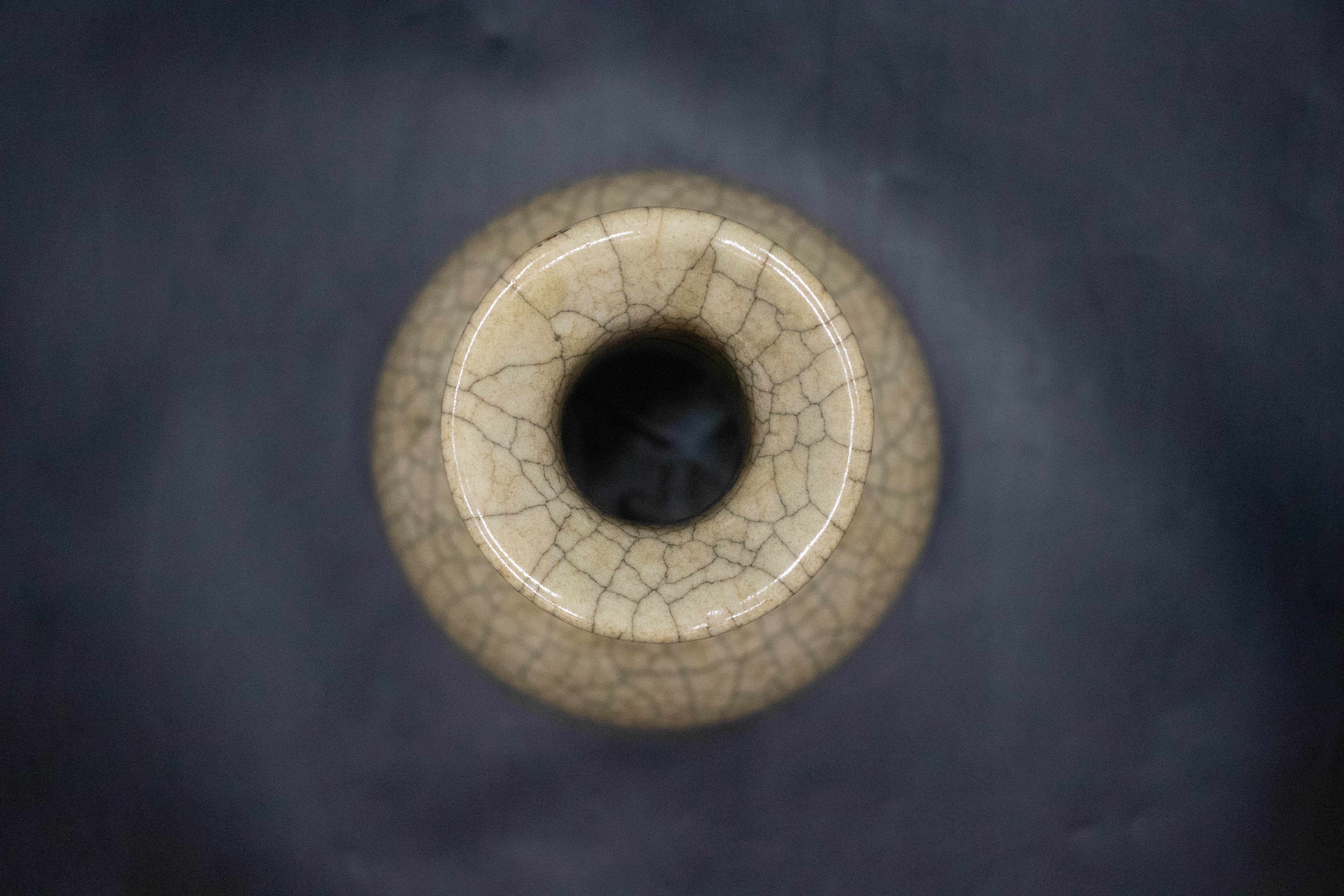 此件盤口瓶為哥窯典型器型,具有極高的歷史與收藏價值。存世量稀缺,哥窯是宋代五大名窯之一,其燒造背景至今存 “南宋說”“北宋說” 等爭議,但學界普遍認可其為南宋時期浙江地區專為宮廷燒造的官窯體系。哥窯以 “開片釉” 著稱,與汝、官、鈞、定窯并稱,是宋代釉飾美學的巔峰代表之一。