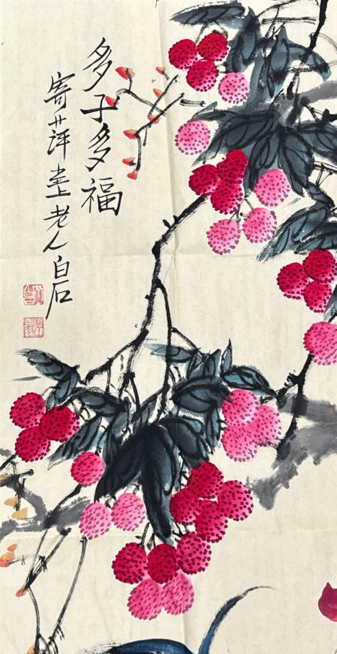 枝干與題款荔枝枝干以篆書筆意入畫,線條蒼勁古拙;題款 “多子多福” 書法樸茂天真,與畫面筆墨渾然一體,完美詮釋 “書畫同源” 的文人畫精髓。