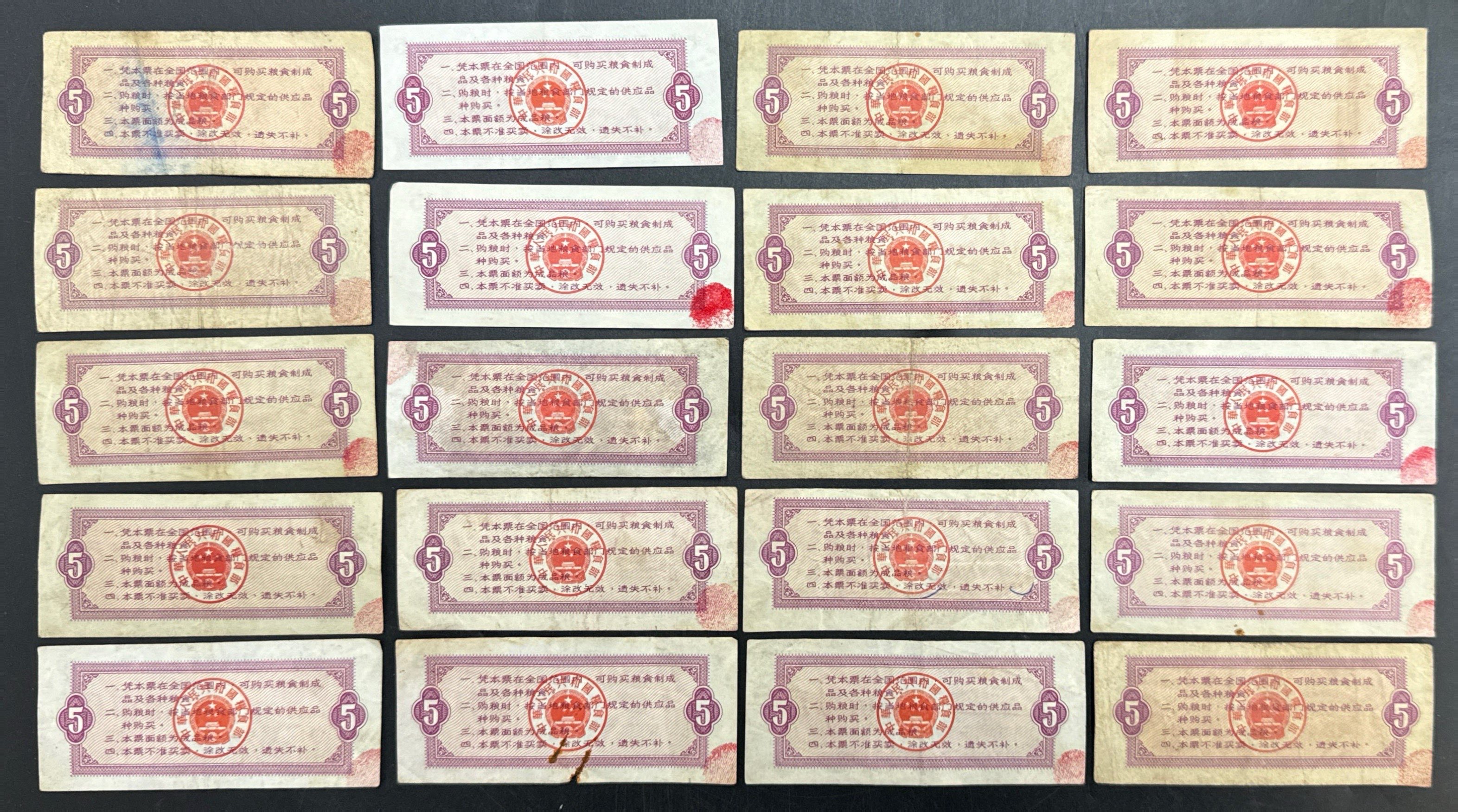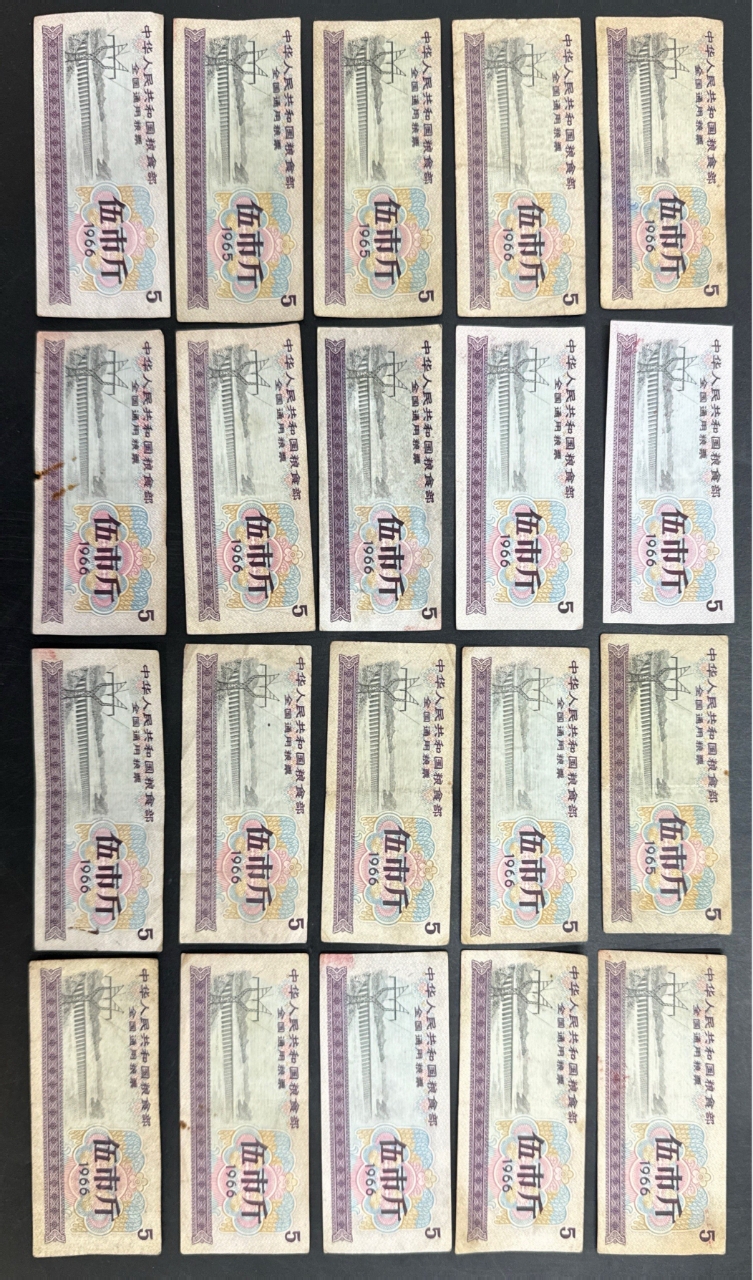 全國通用糧票因其獨特的歷史意義和文化內涵,在收藏市場備受關注。這組1966年伍市斤糧票數量達20張,雖品相參差不齊,但作為同一時期、同一面額的糧票集合,進一步豐富了其收藏與研究價值。它是糧票收藏愛好者構建糧票收藏體系、研究糧票版式與歷史背景的重要標本,同時也因承載著計劃經濟時期的集體記憶,成為眾多藏家追溯時代變遷的生動載體,兼具歷史研究價值、文化價值與收藏趣味。